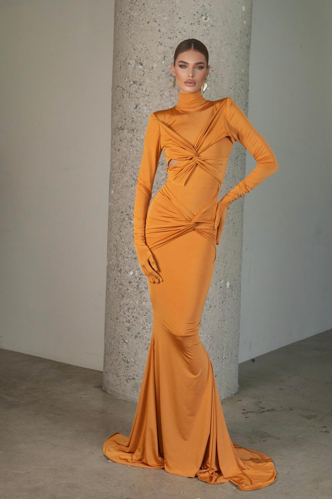 Frankie high neck long sleeve dress crafted from a blend of nylon and spandex, featuring gloves that are integrated into the design. The dress includes a soft padded shoulder for added structure and comfort, with a closed zipper at the back for easy wear. The mermaid hemline creates a flattering silhouette, and a small cutout under the bust adds a subtle sensual touch.