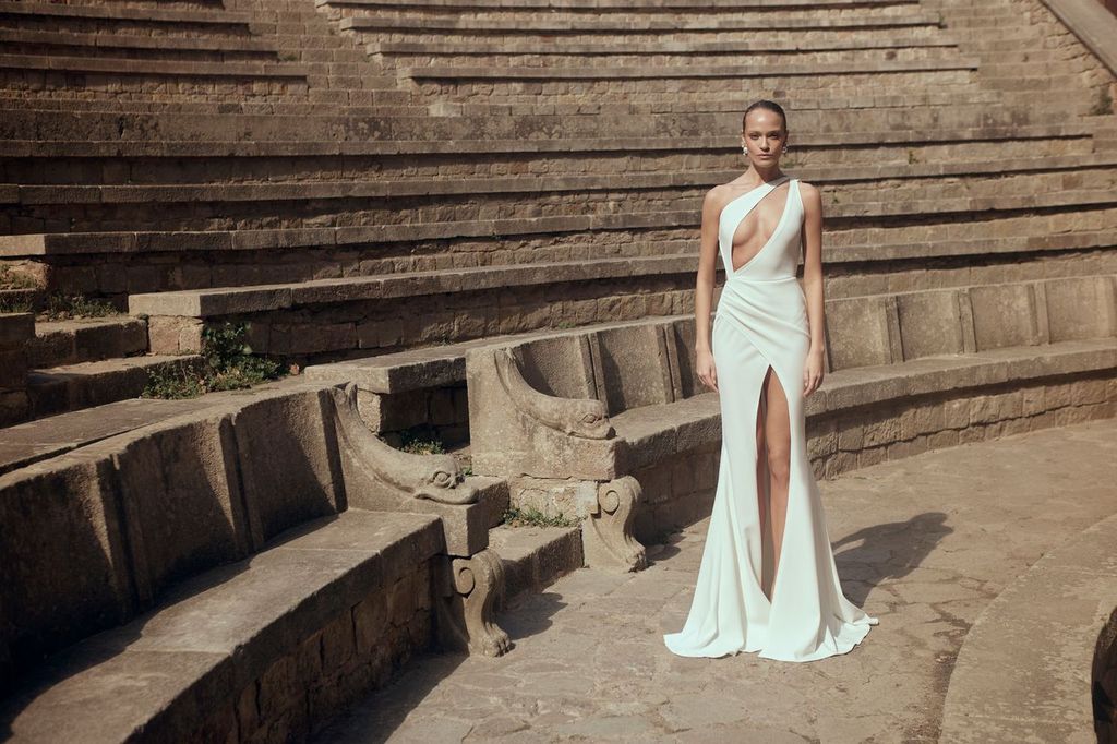 Ivory matte jersey gown with asymmetrical cut out one shoulder and high slit.