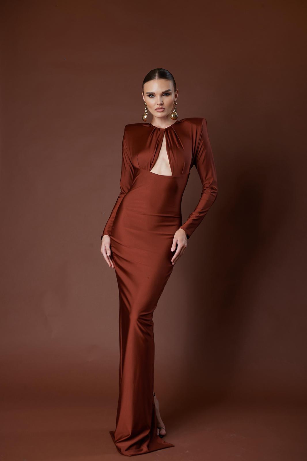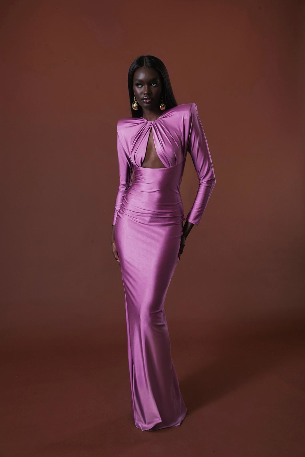 A514 High neck, long sleeve strong shoulder column gown with pyramid cut out detail at bust