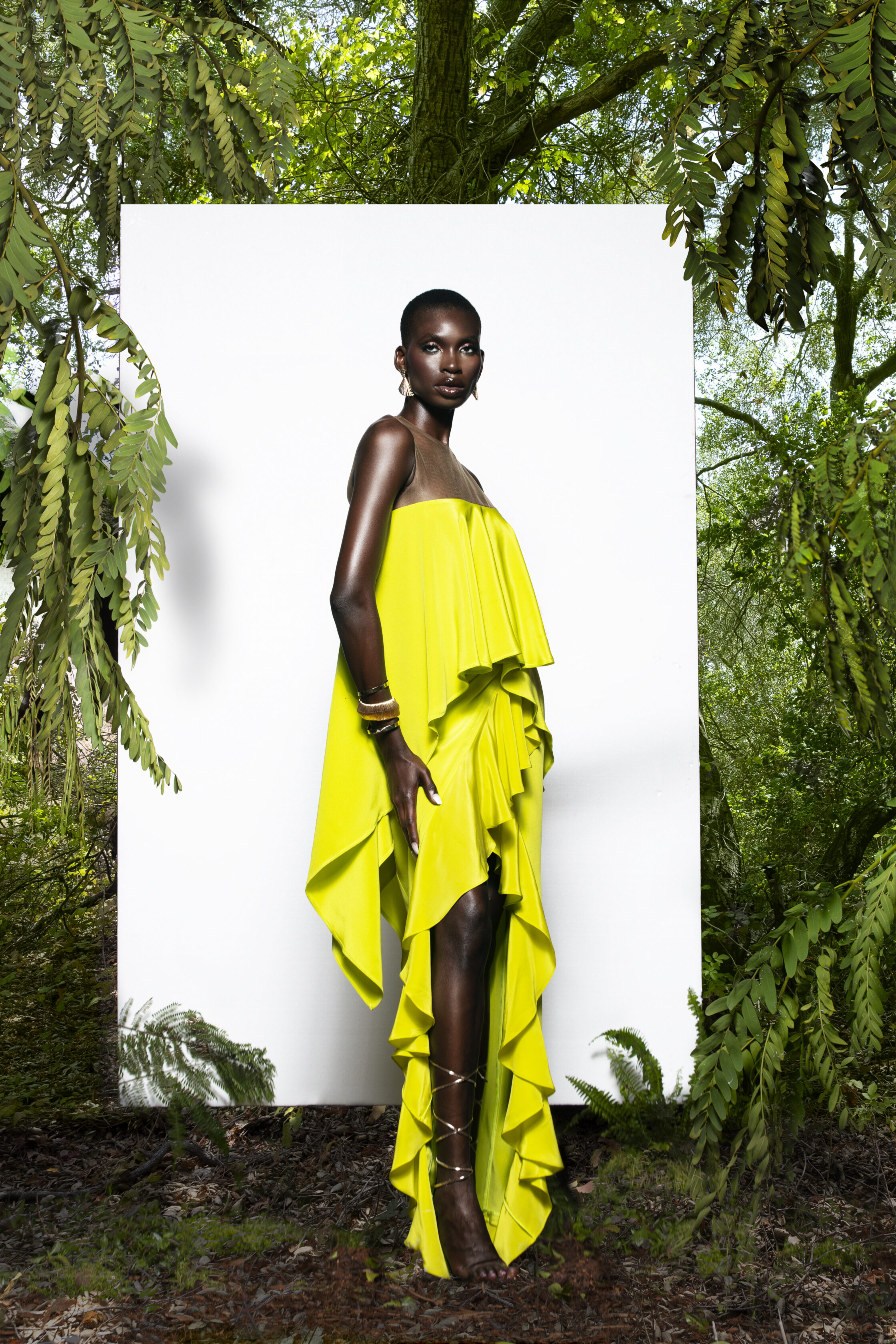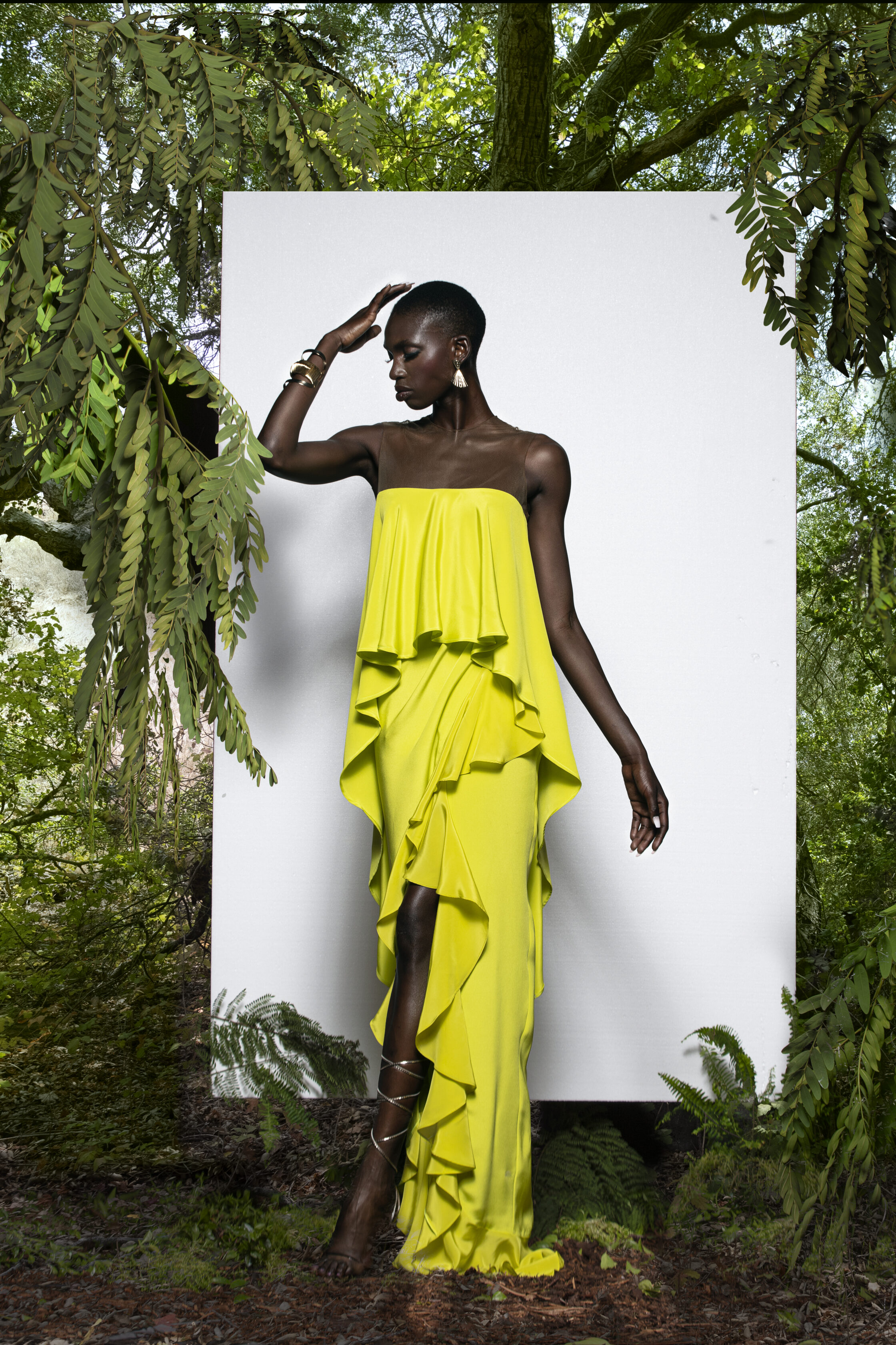 Chartreuse, strapless, cascading, ruffled gown and double silk back fabric.