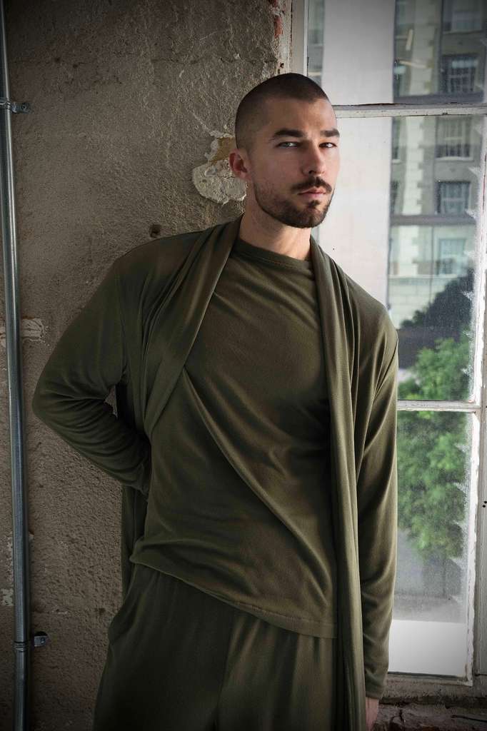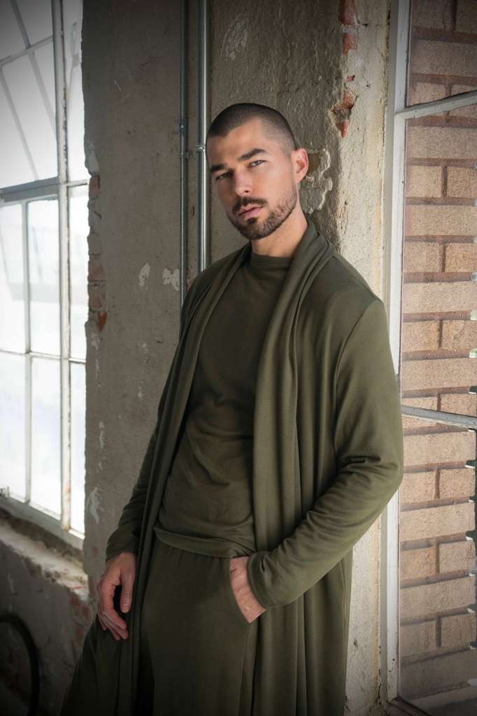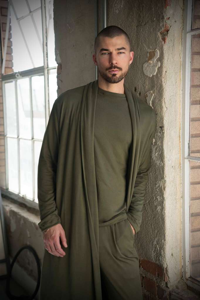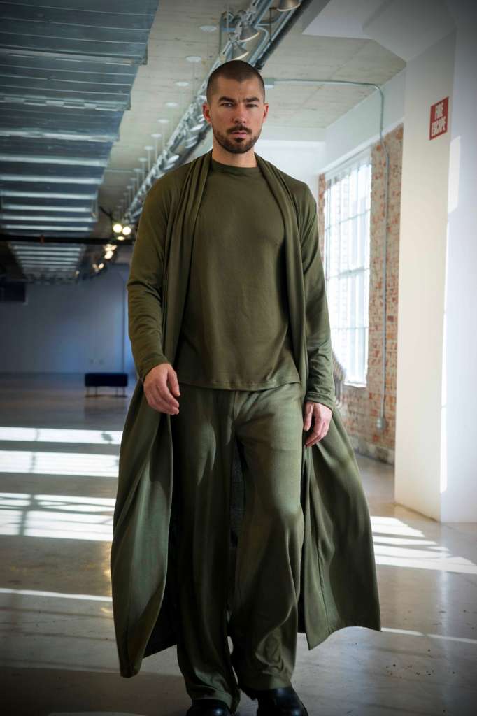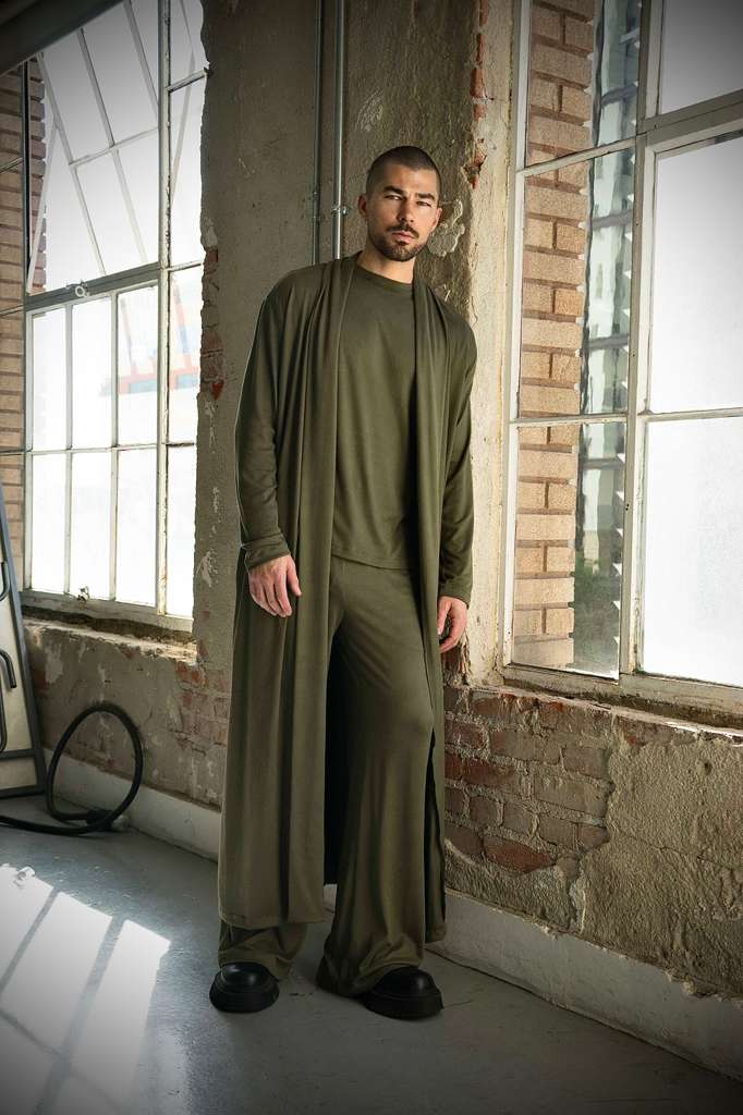 Olive green three-piece men’s lux ensemble crafted from premium fabrics. It includes a sophisticated Ashawl collar overcoat with deep, well-stitched hidden pockets for secure storage. The ensemble features a long-sleeve, crew-neck shirt designed for a relaxed fit, offering comfort and style. Complementing the look are wide-leg, elastic waistband pants made for a comfort-fit experience, equipped with deep side pockets for practicality.